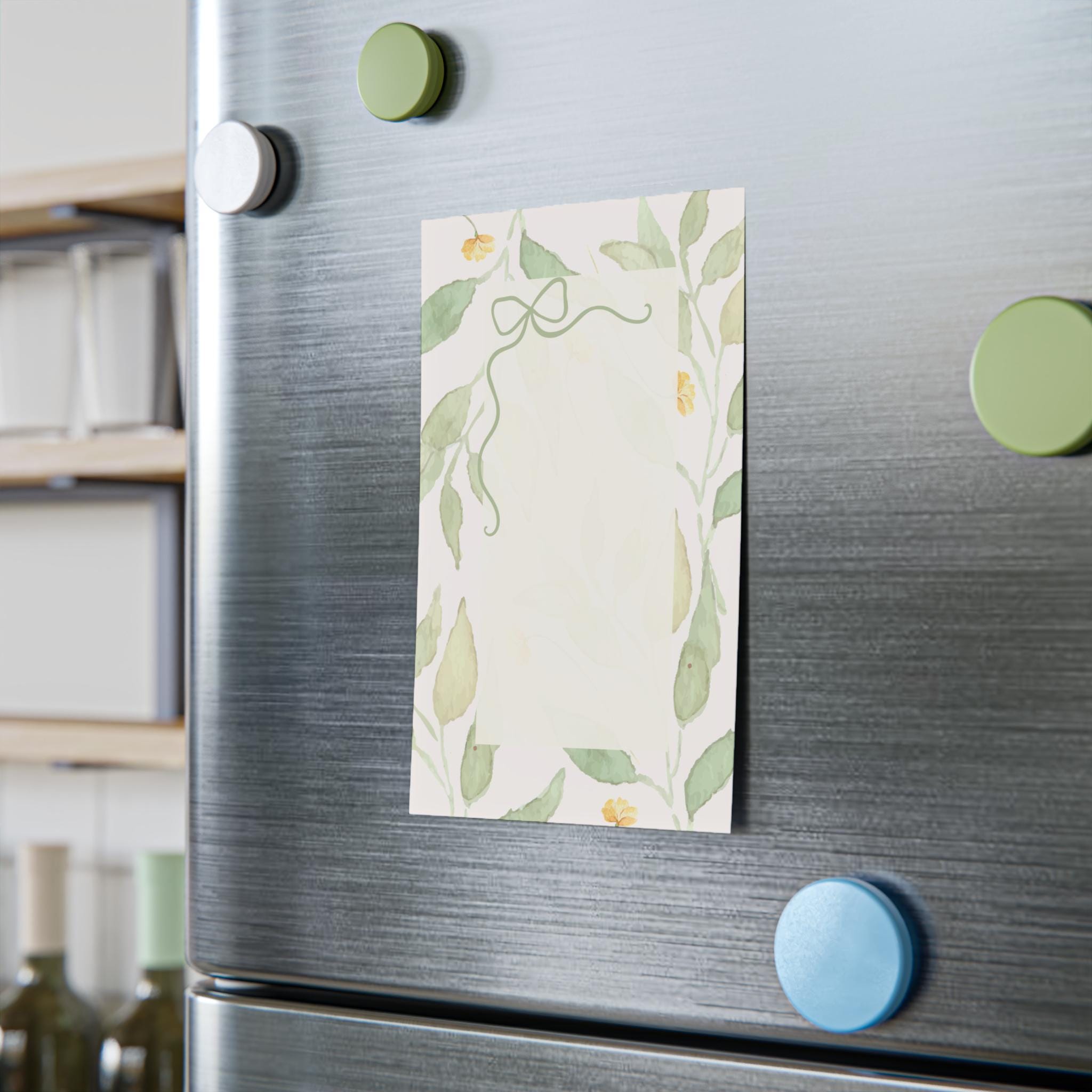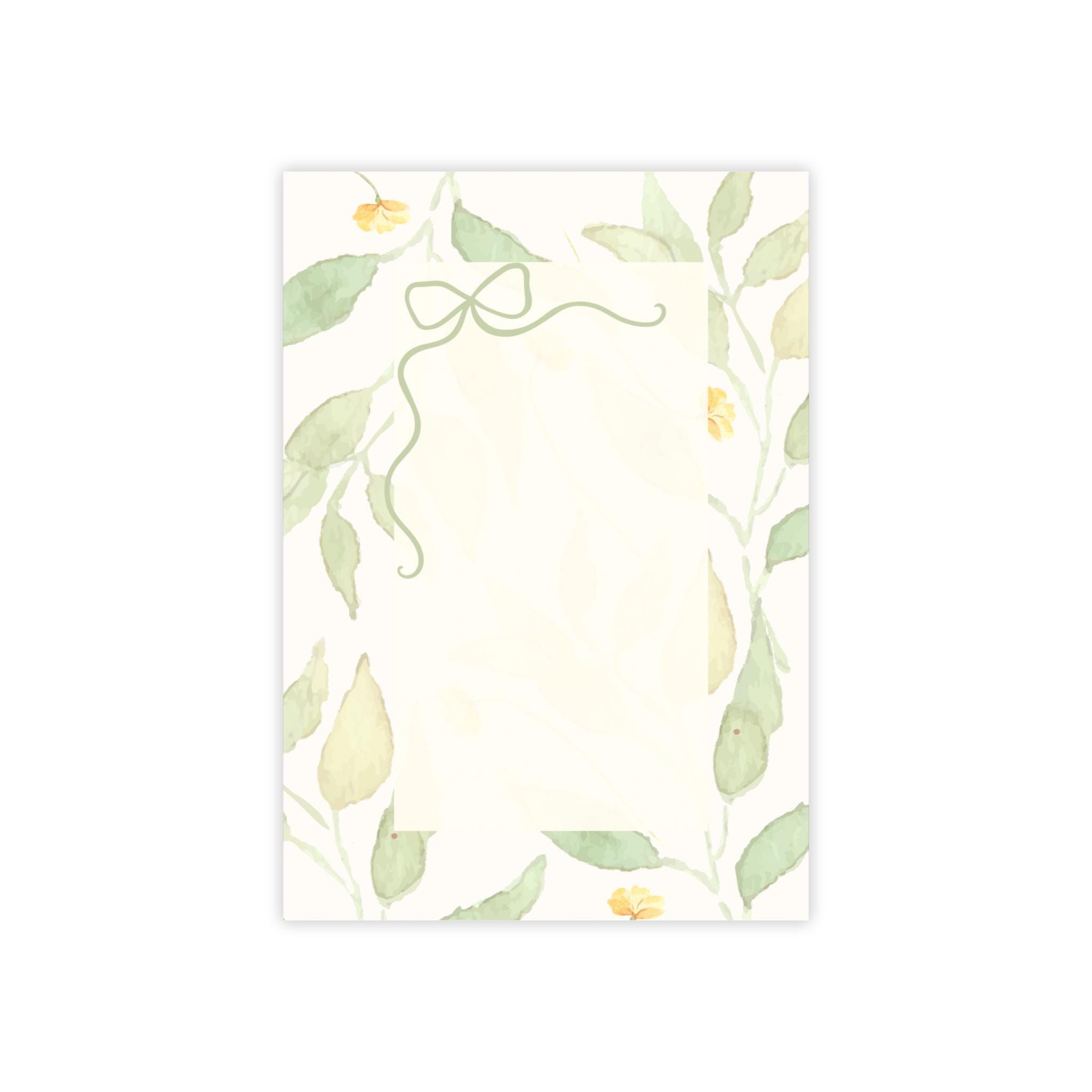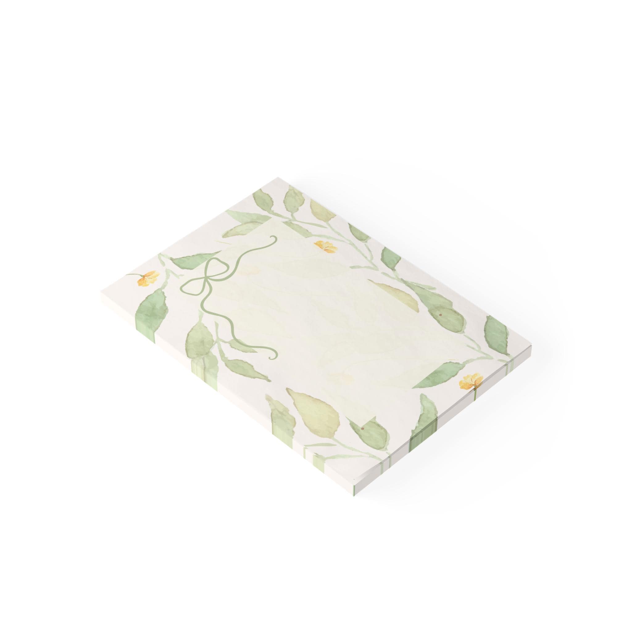 A small stack of watercolor-leaf Post-it® note pads that bring a gentle, sunlit touch to everyday lists and quick thoughts. Soft green leaves and tiny yellow blooms frame a warm cream writing area, while a delicate bow at the top gives each sheet a handcrafted, stationery feel. The one-design, single-sided print keeps handwriting clear and the bright colors stay true thanks to modern printing techniques. Light adhesive holds notes securely yet peels away cleanly, and each pad includes 50 sheets with the branded Post-it® backing and a removable slip-sheet for easy sorting. These pads are assembled in the USA from globally sourced parts — a little everyday luxury that slides into a bag, stacks on a desk, or tucks into a planner.