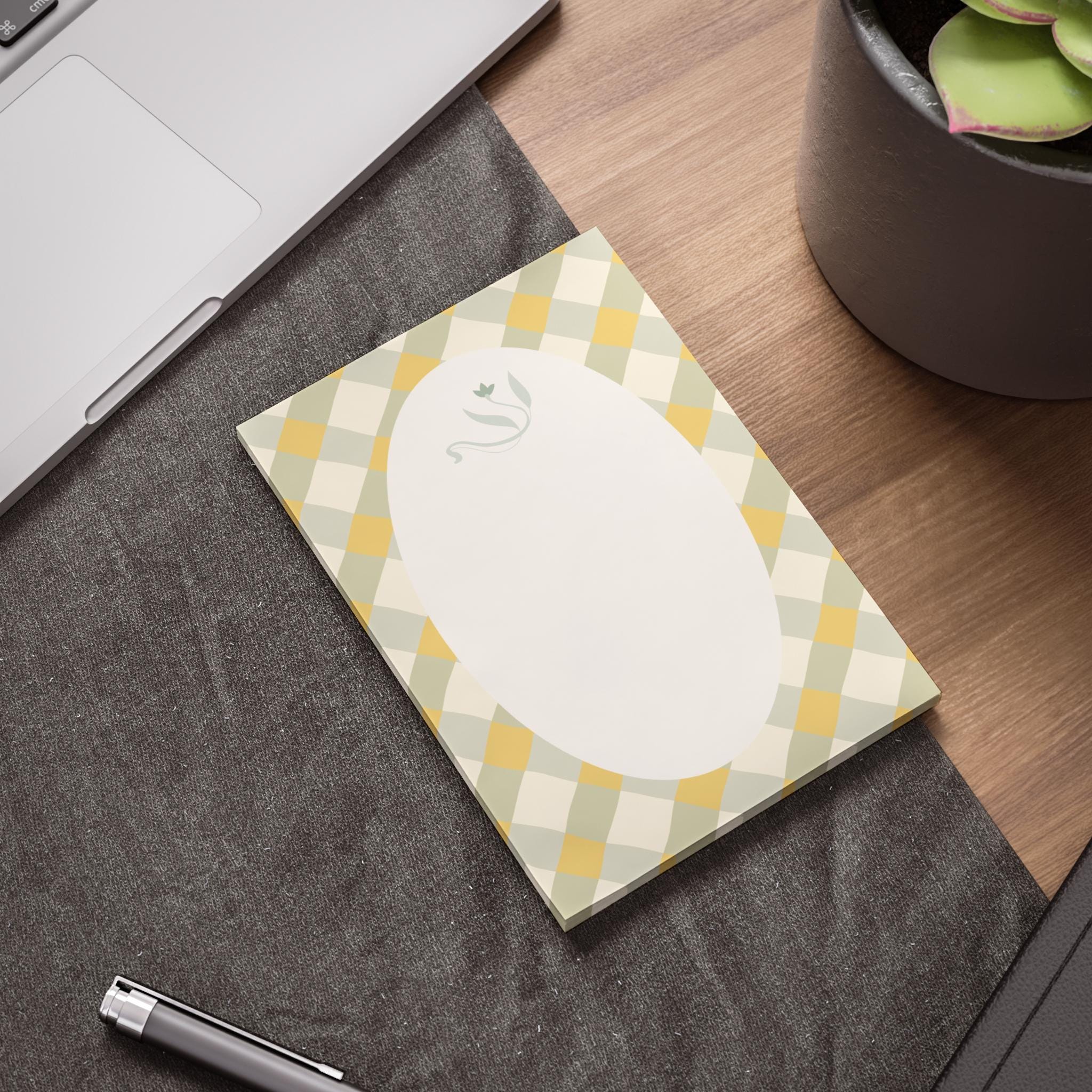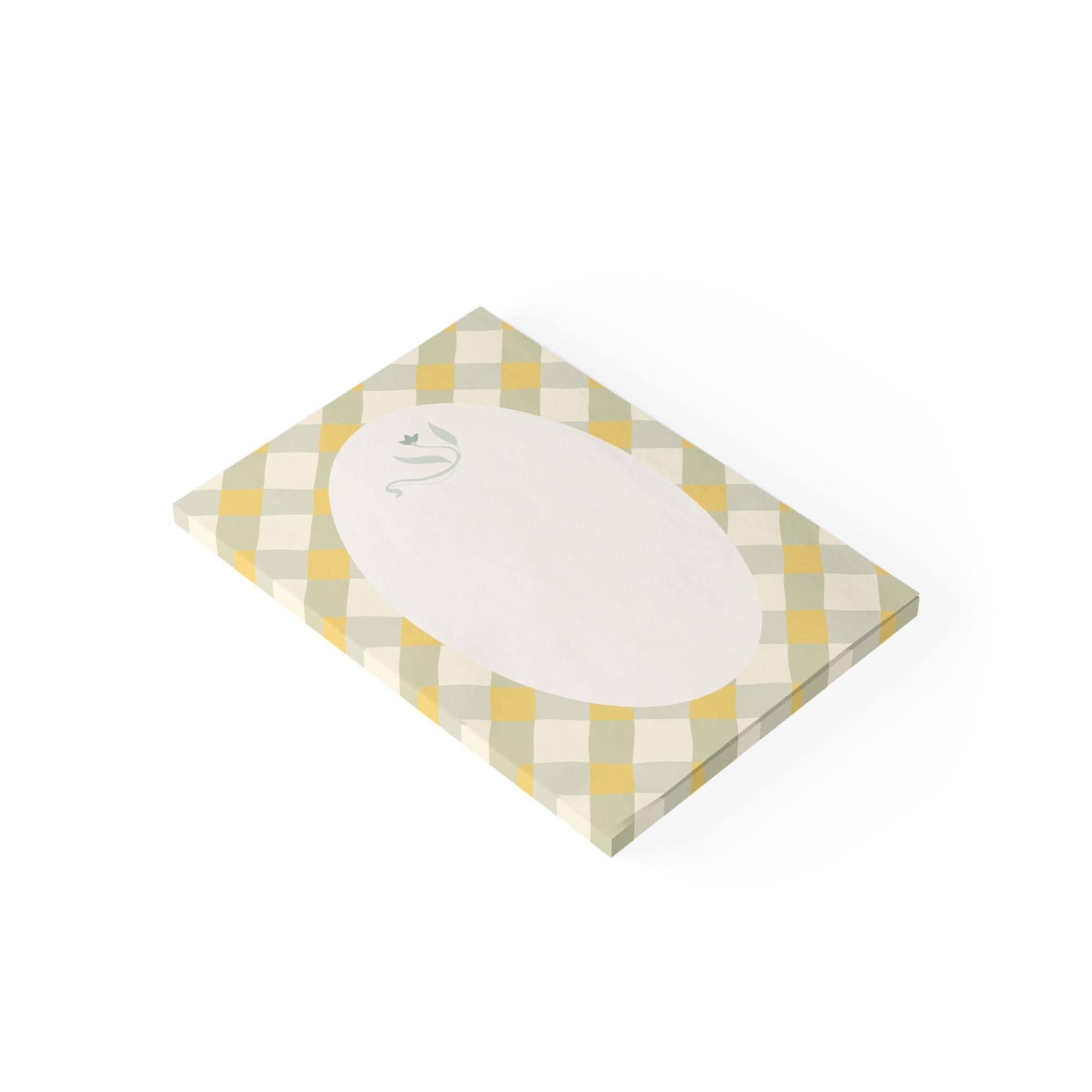 Sunlit Memo Pads with a soft vintage gingham frame and a delicate floral vignette. Each sheet leaves a gentle oval writing area that feels like a small pause in a busy day — warm, calm, and inviting. Slip one on your desk to jot quick thoughts, grocery lists, or little reminders; the muted yellow and sage checks bring a cozy, cottage-core touch that makes everyday notes feel thoughtful. The crisp white uncoated paper accepts pen and pencil cleanly, and the reliable Post-it® adhesive keeps sheets where you need them without leaving residue behind. Assembled in the USA with care, these pads bring a quiet, domestic charm to workspaces, kitchens, and bedside tables.