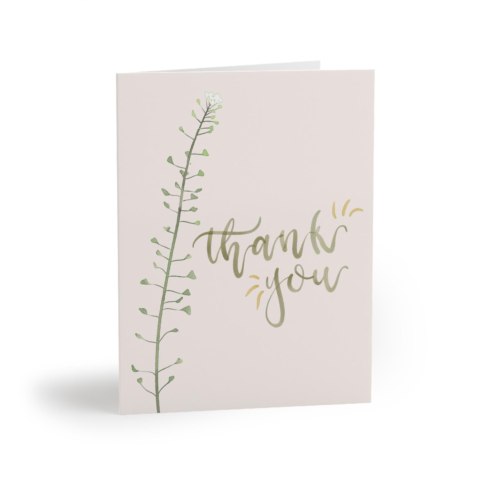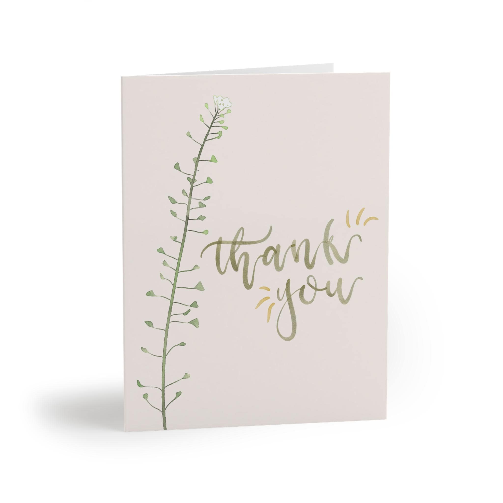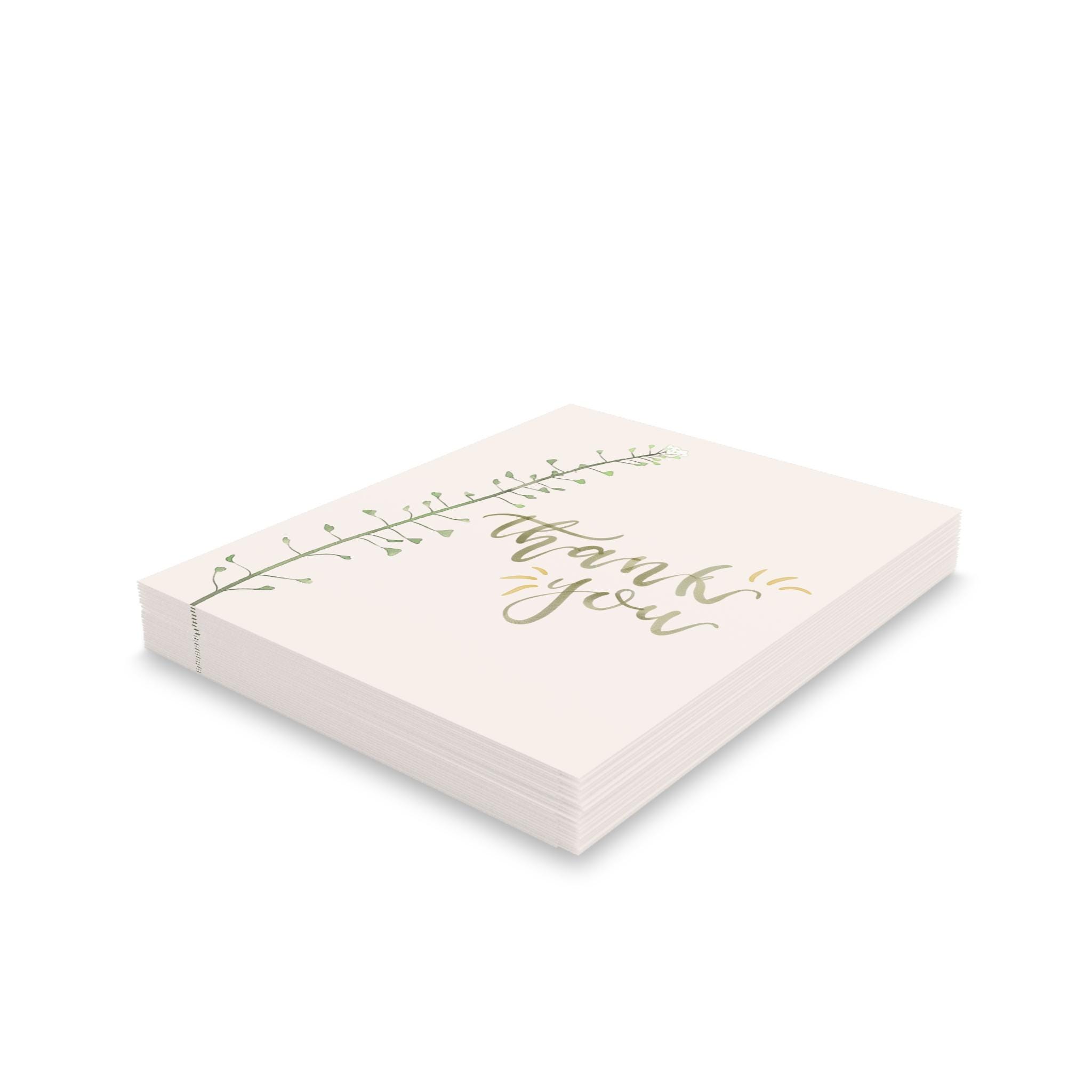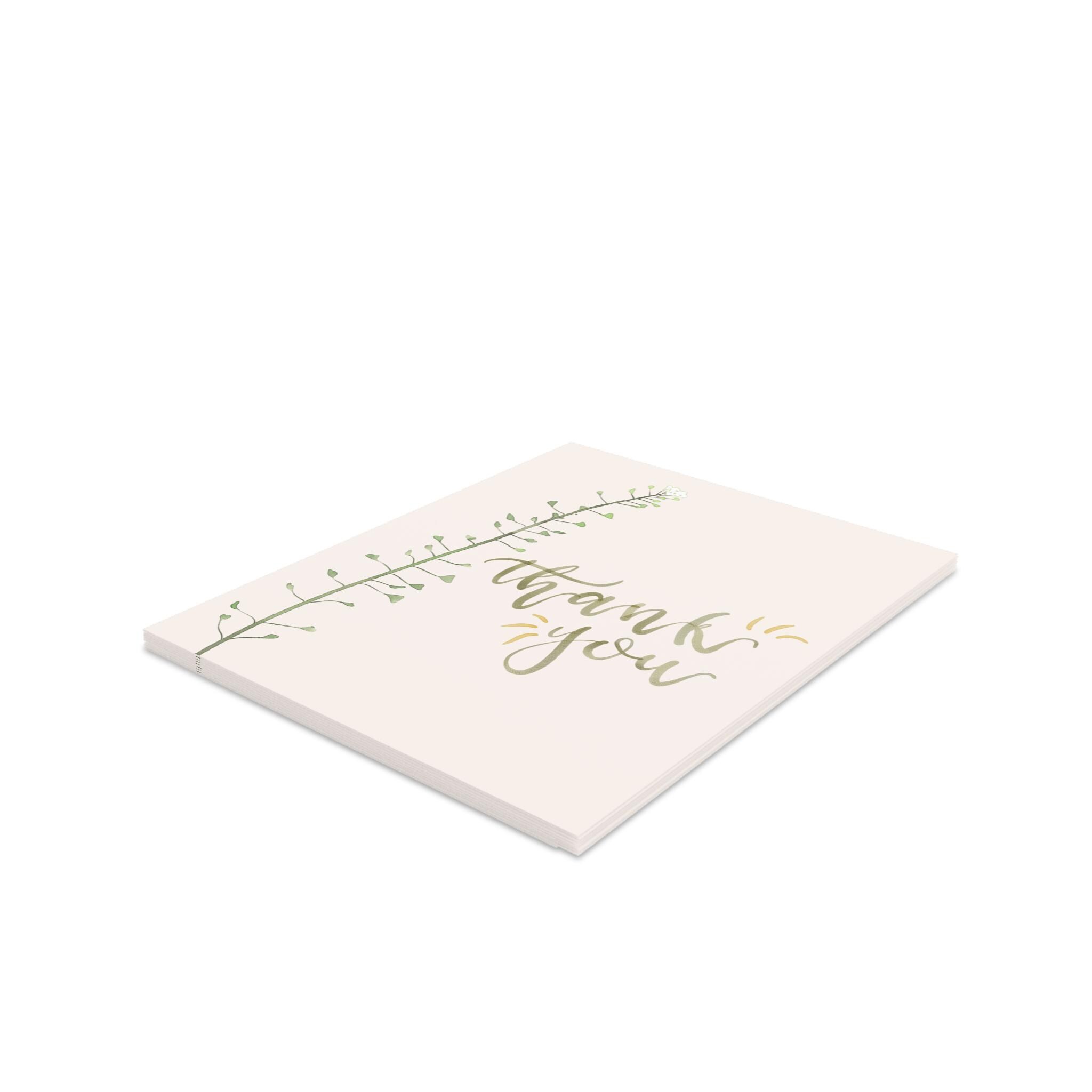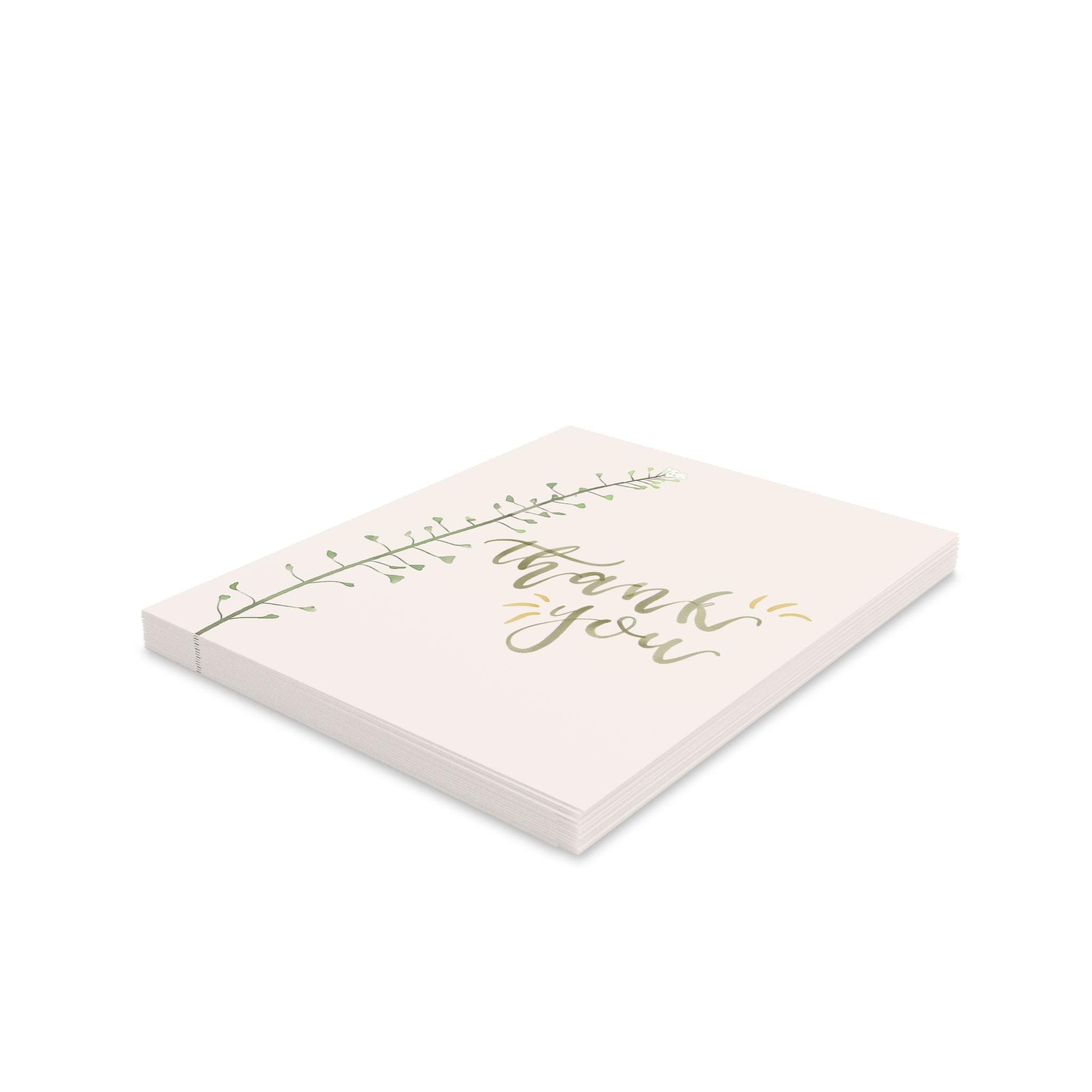 Soft, understated gratitude captured on a crisp matte card. A single slender sprig climbs the left edge, its tiny leaves rendered in gentle greens against a warm cream background. The hand-lettered “thank you” flows in muted gold brushstrokes, small gold accents catching the eye without shouting. Folded for a personal note inside, these cards arrive with matching white envelopes so you can write, seal, and send a quiet, sincere message in minutes. They sit beautifully on a mantel, tucked into a gift, or slipped into a delivery to brighten someone’s day.
