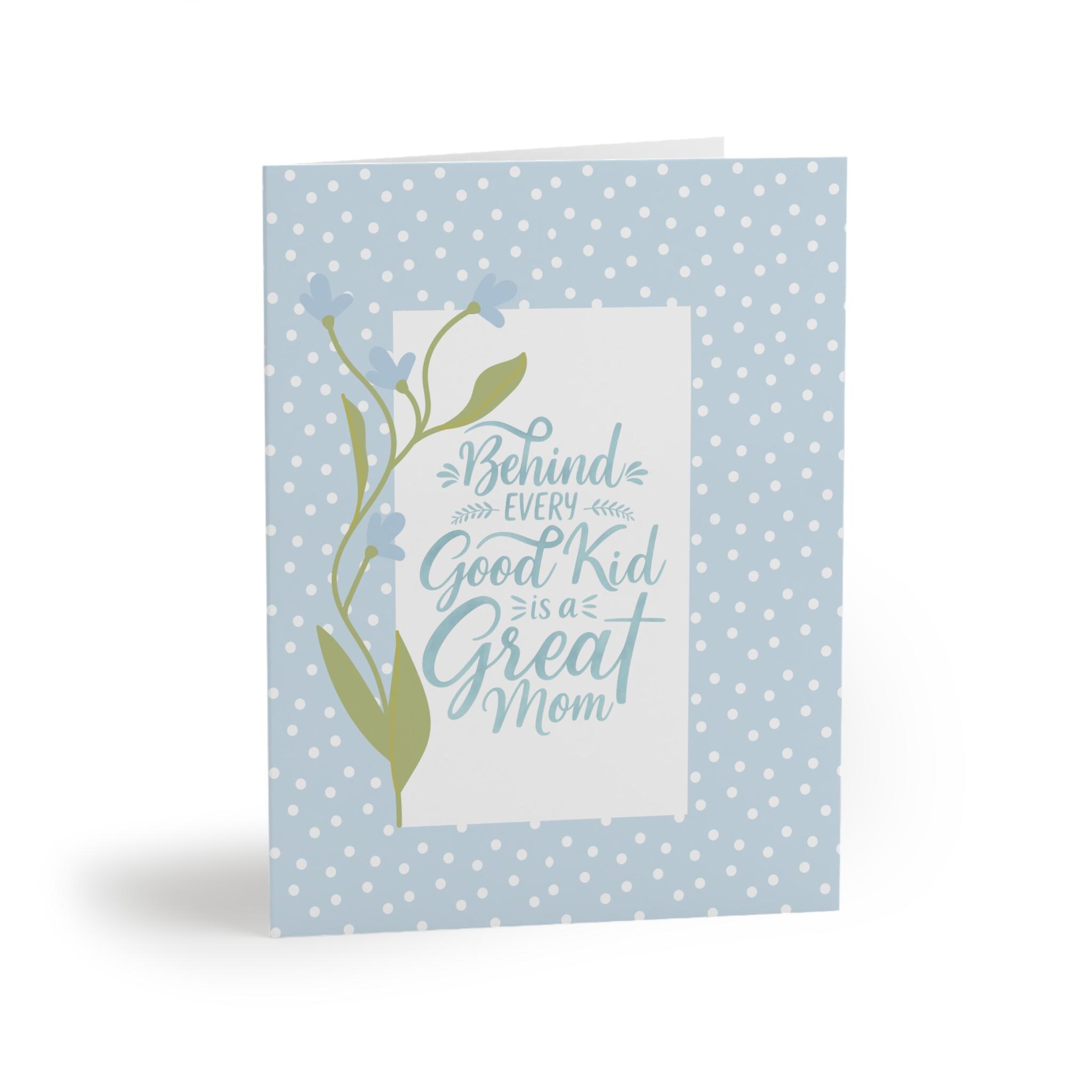 A soft, heartfelt card set that celebrates everyday motherhood with gentle charm. Pale blue polka dots frame a white panel where flowing script reads “Behind every good kid is a great mom,” accompanied by a delicate sprig of flowers. The matte finish keeps the colors muted and elegant, giving each card a warm, handcrafted feel that matches notes of gratitude, encouragement, or quiet appreciation. Each card comes with a crisp white envelope and can be printed inside for a personal message — small gestures that carry sincere sentiment.