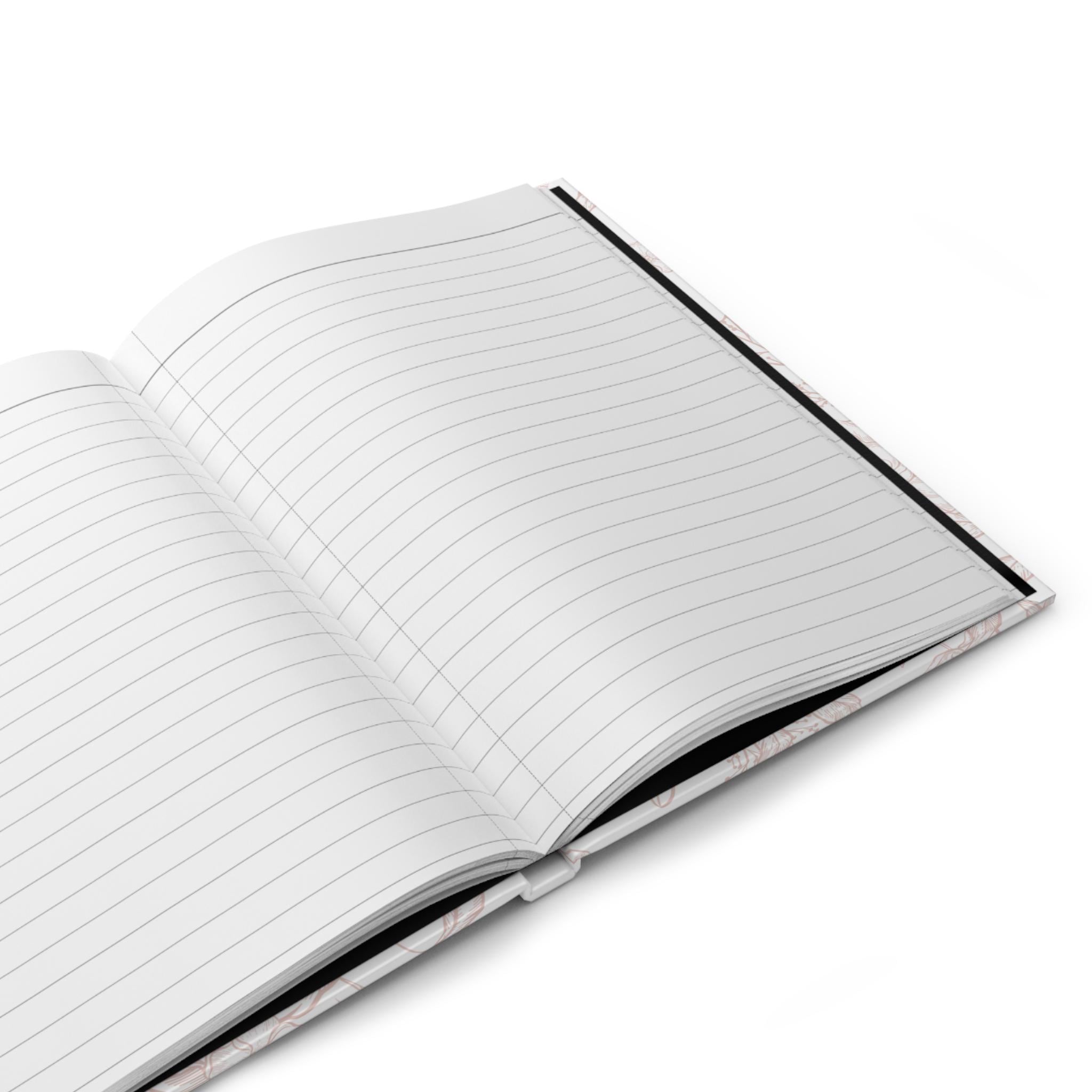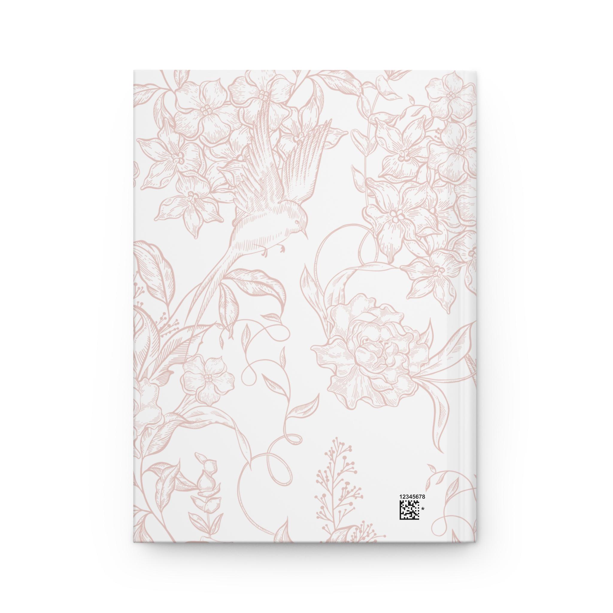 A soft, elegant hardcover journal wrapped in a matte-laminated cover, designed for quiet moments and thoughtful notes. The cover art features delicate, hand-drawn floral and bird motifs in a muted blush tone that wraps fully around the book, giving it a refined, cohesive look. Inside, 150 lined pages sit on a flexible sewn spine that opens flat for comfortable writing. Perforated sheets let you detach pages cleanly when you need to share a note or remove a draft. The matte finish keeps reflections low and invites your hand to linger on the smooth surface—this is a notebook that feels personal, calm, and intentional.