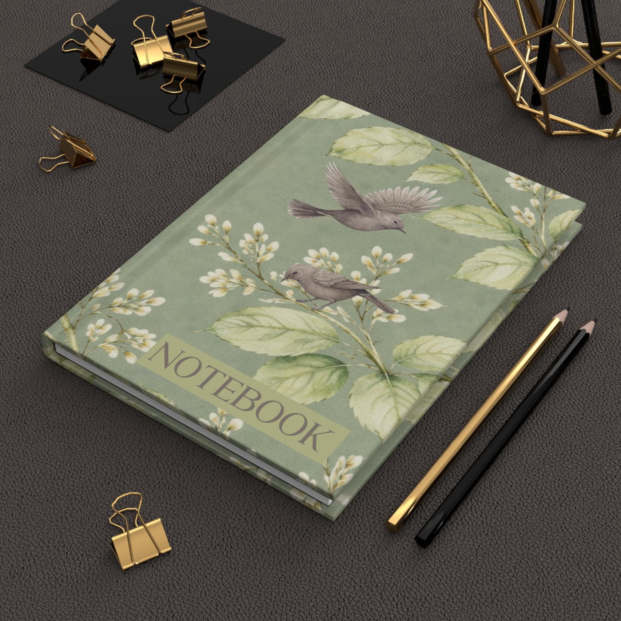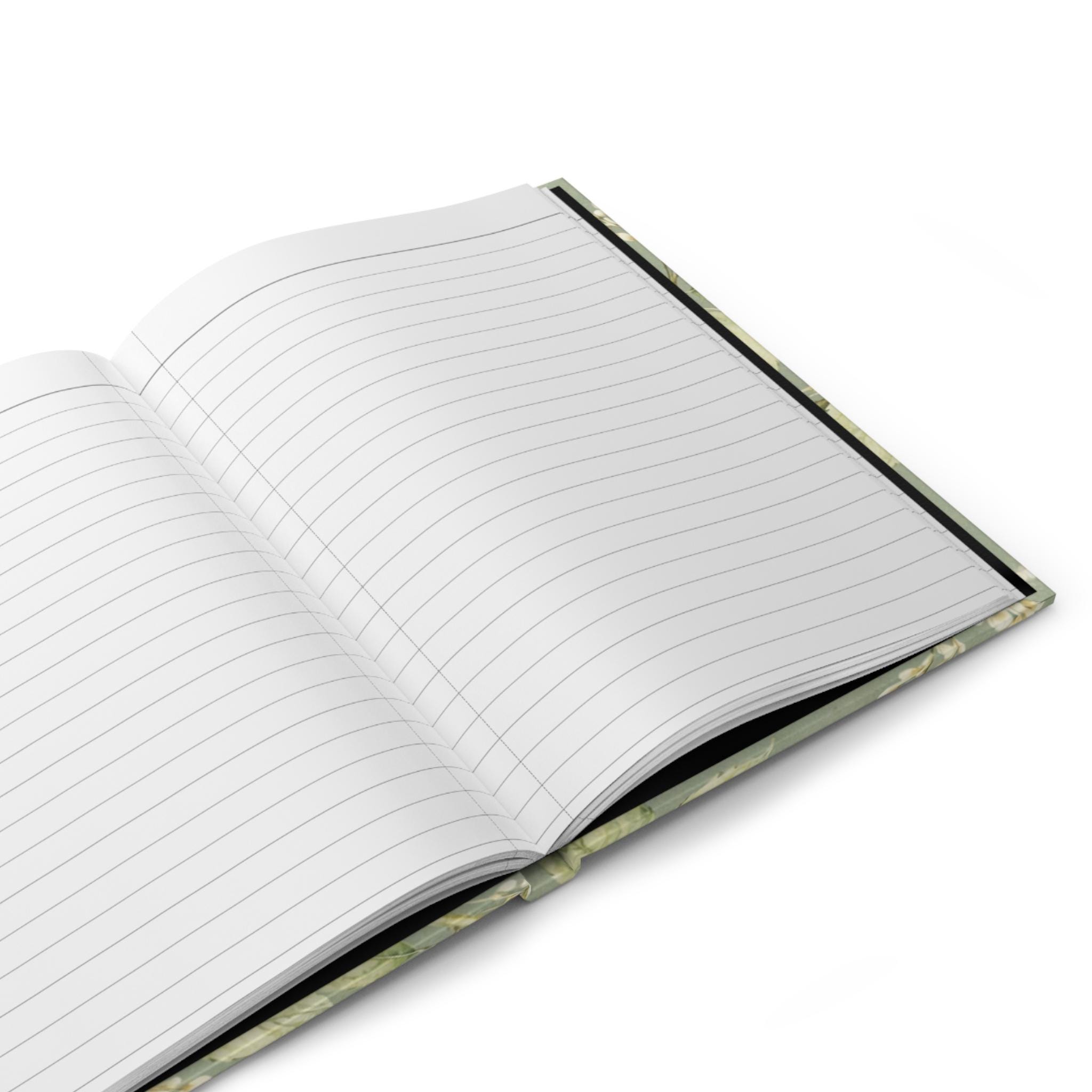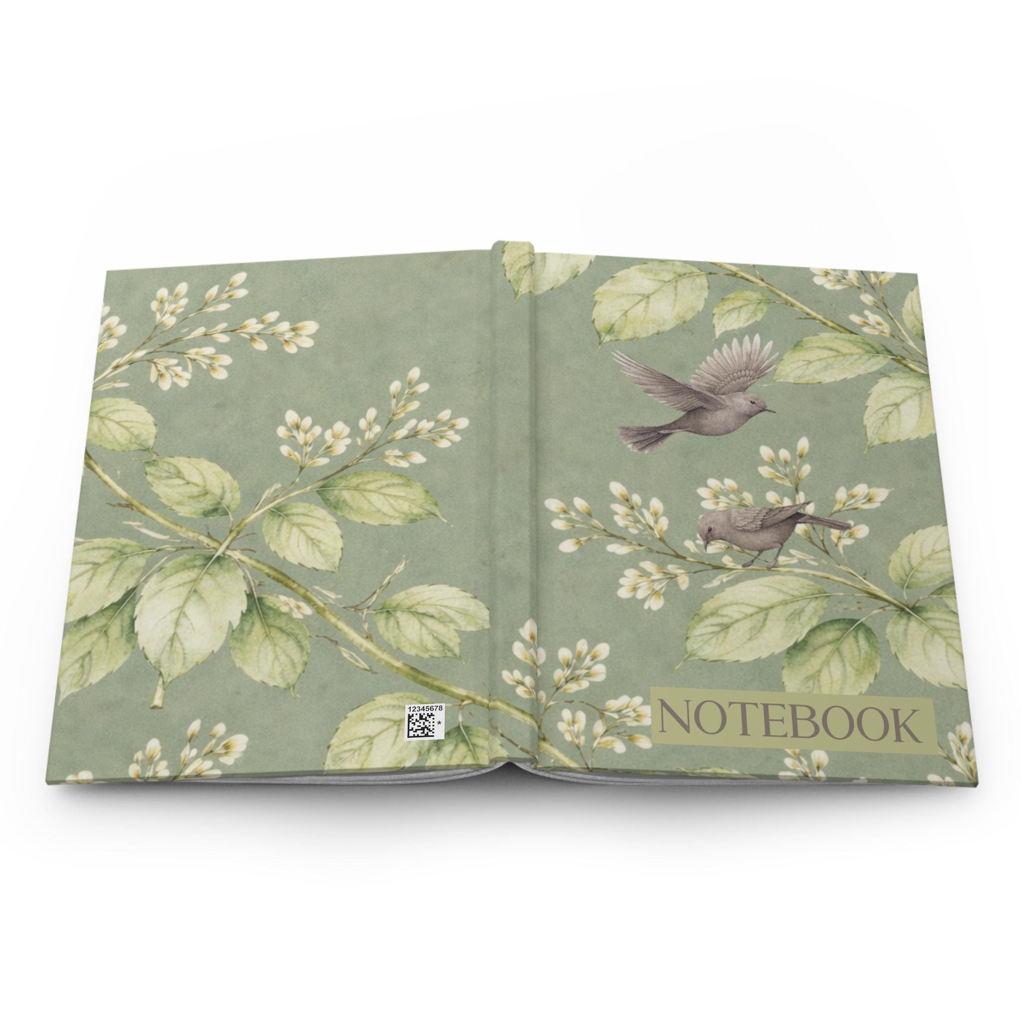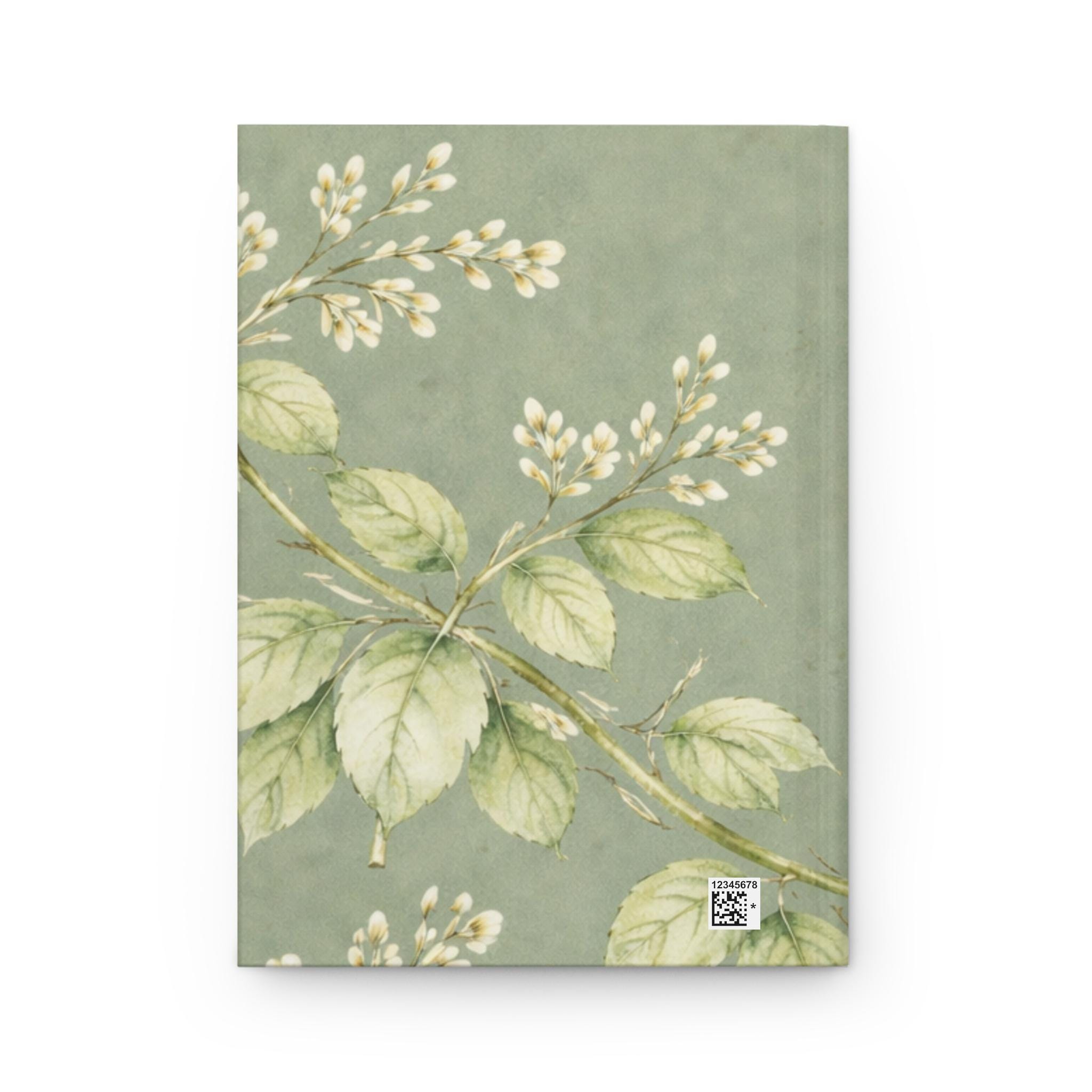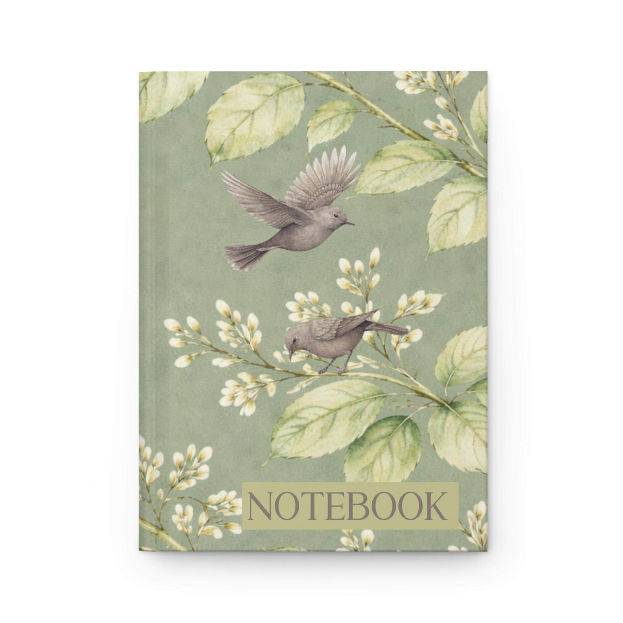 A soft, vintage-inspired hardcover journal with a matte laminated cover and full-wrap botanical print. Gentle sage-green foliage and delicate white blossoms flow across the front and back, while two small songbirds hover above, inviting quiet moments of thought. The sewn casewrap binding keeps the book flexible and lays flat as you write. Inside are 150 lined pages with perforations for easy removal — neat, tactile paper for lists, letters, sketches, or everyday journaling. A subtle matte finish mutes glare and adds a refined, tactile feel that complements the calming, old-world illustration.