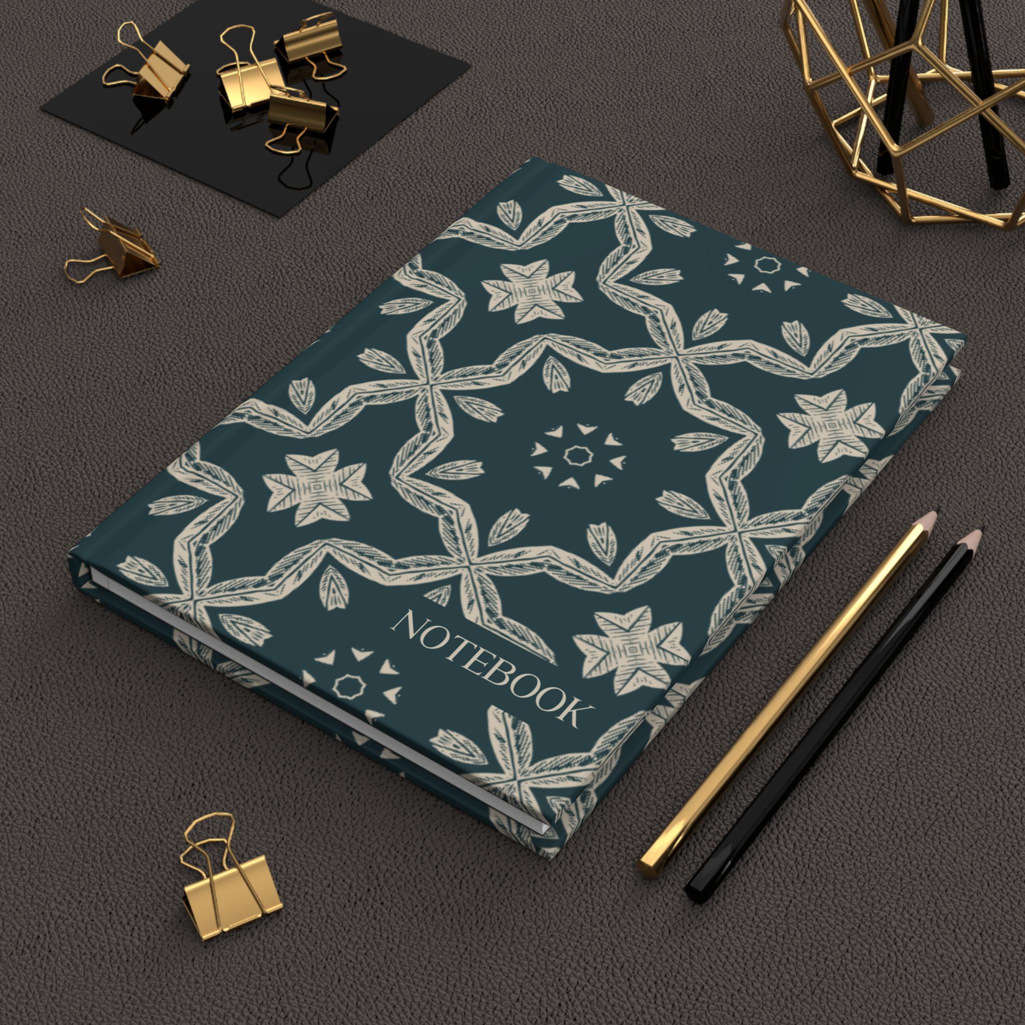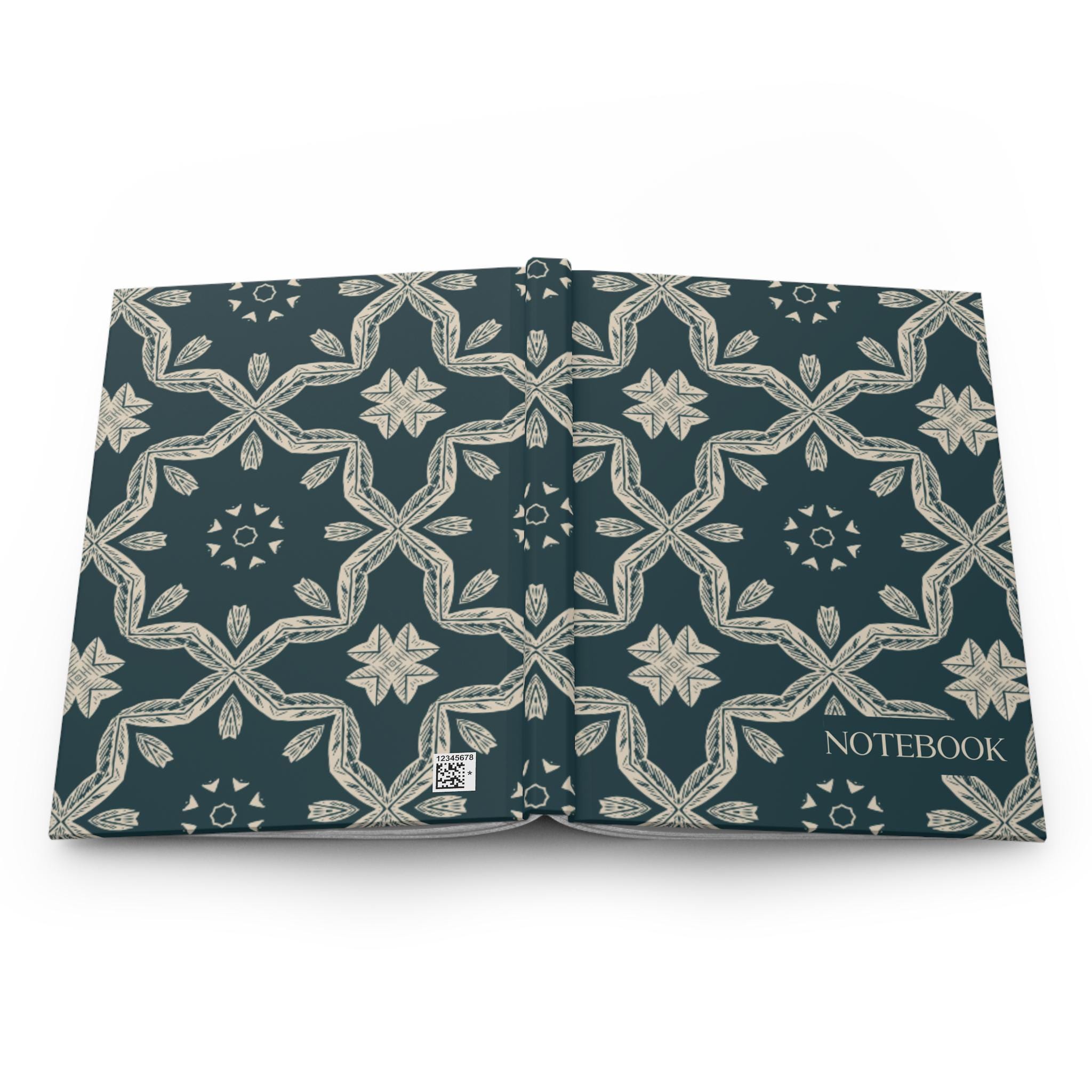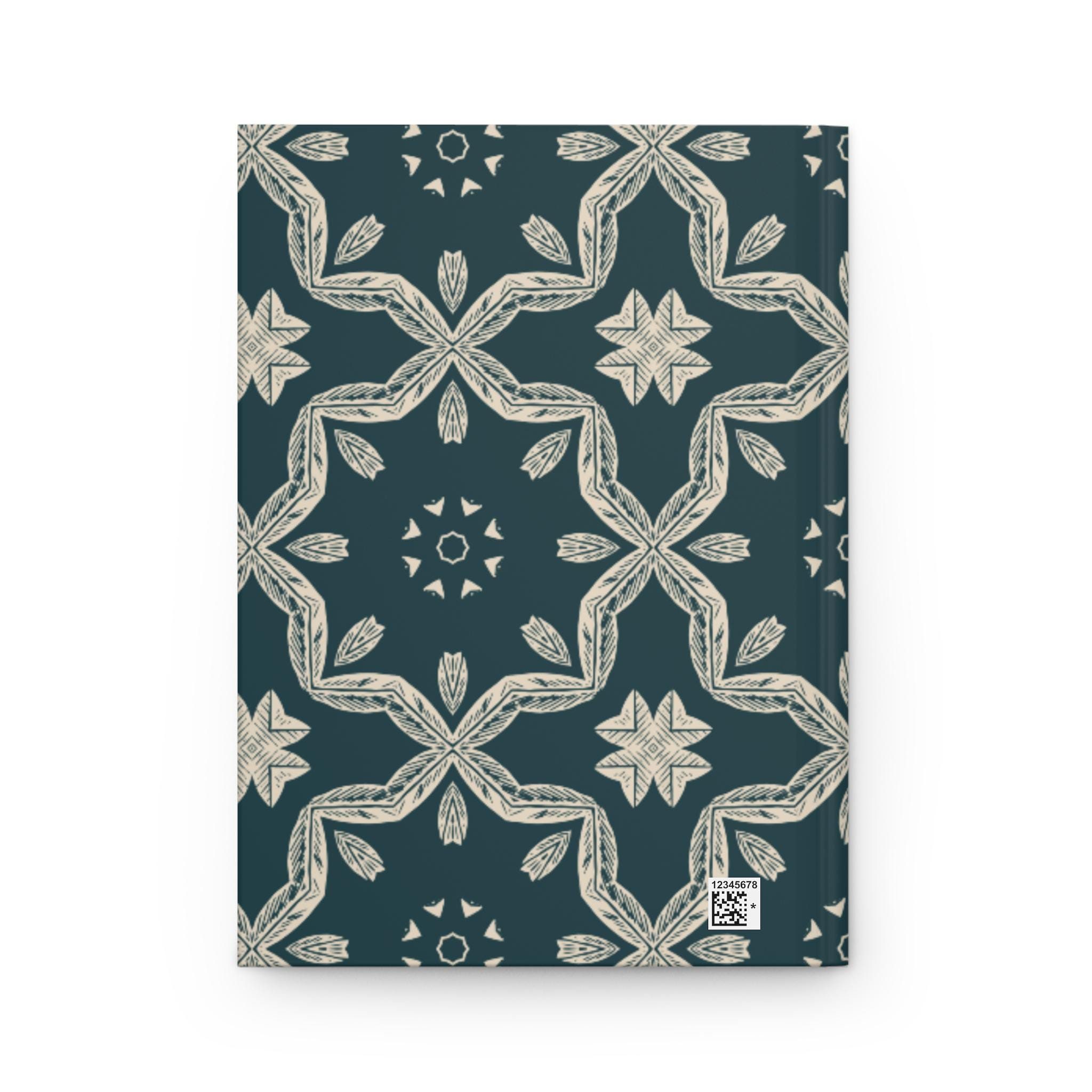 This hardcover journal brings calm order to your daily notes with a quietly elegant, wraparound pattern. The deep teal background and cream ornamental motifs feel like a tucked-away study or a slow morning ritual. It lies flat on the desk thanks to casewrap (sewn) binding and offers 150 lined pages for lists, sketches, plans, or reflections. The matte laminated cover softens light and resists scuffs, while perforated pages give you the option to remove a sheet cleanly when a page needs to be shared. Compact and tactile, this notebook slips into a bag and becomes the place you return to when you want to think clearly and write without fuss.