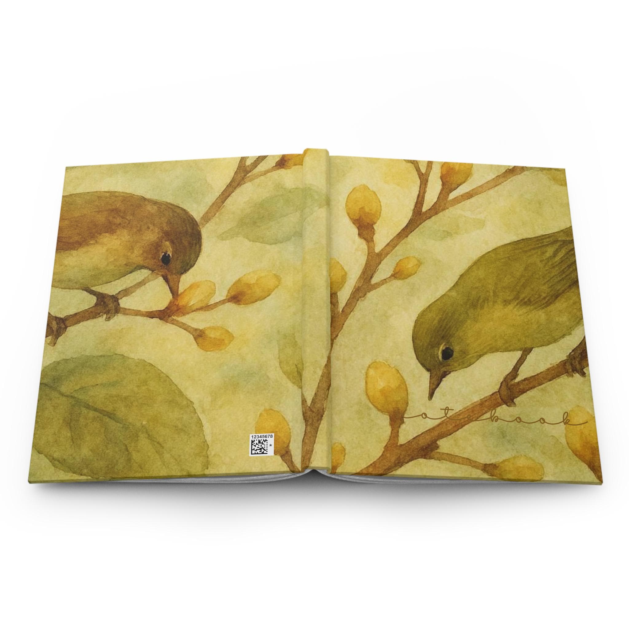 This hardcover journal opens like a quiet morning in a sunlit garden. The matte, wraparound cover shows gentle watercolor birds perched among budding branches — soft greens and warm golds that calm the eye. Inside, 150 lined pages lie flat thanks to the sewn casewrap binding, giving you smooth, uninterrupted writing. Perforated sheets let you share a poem or tear out a sketch without harming the spine. The matte lamination preserves the delicate colors while resisting wear, so the art stays muted and elegant on your shelf. Keep it by the window for morning pages, slip it into a tote for nature walks, or use it on your kitchen table to gather thoughts between sips of tea.