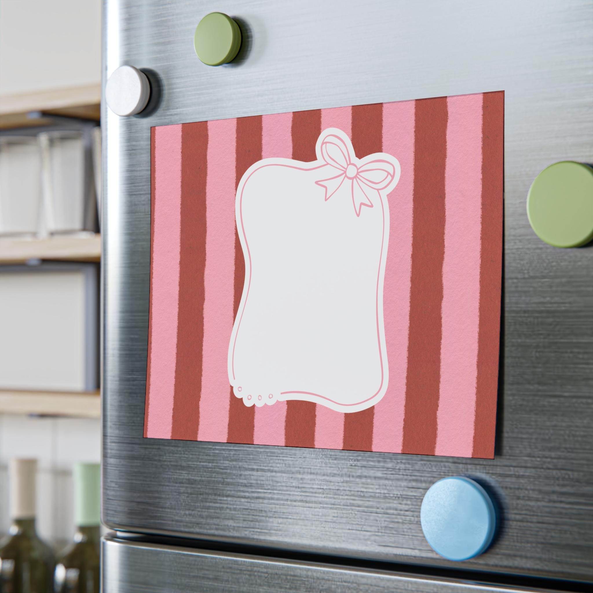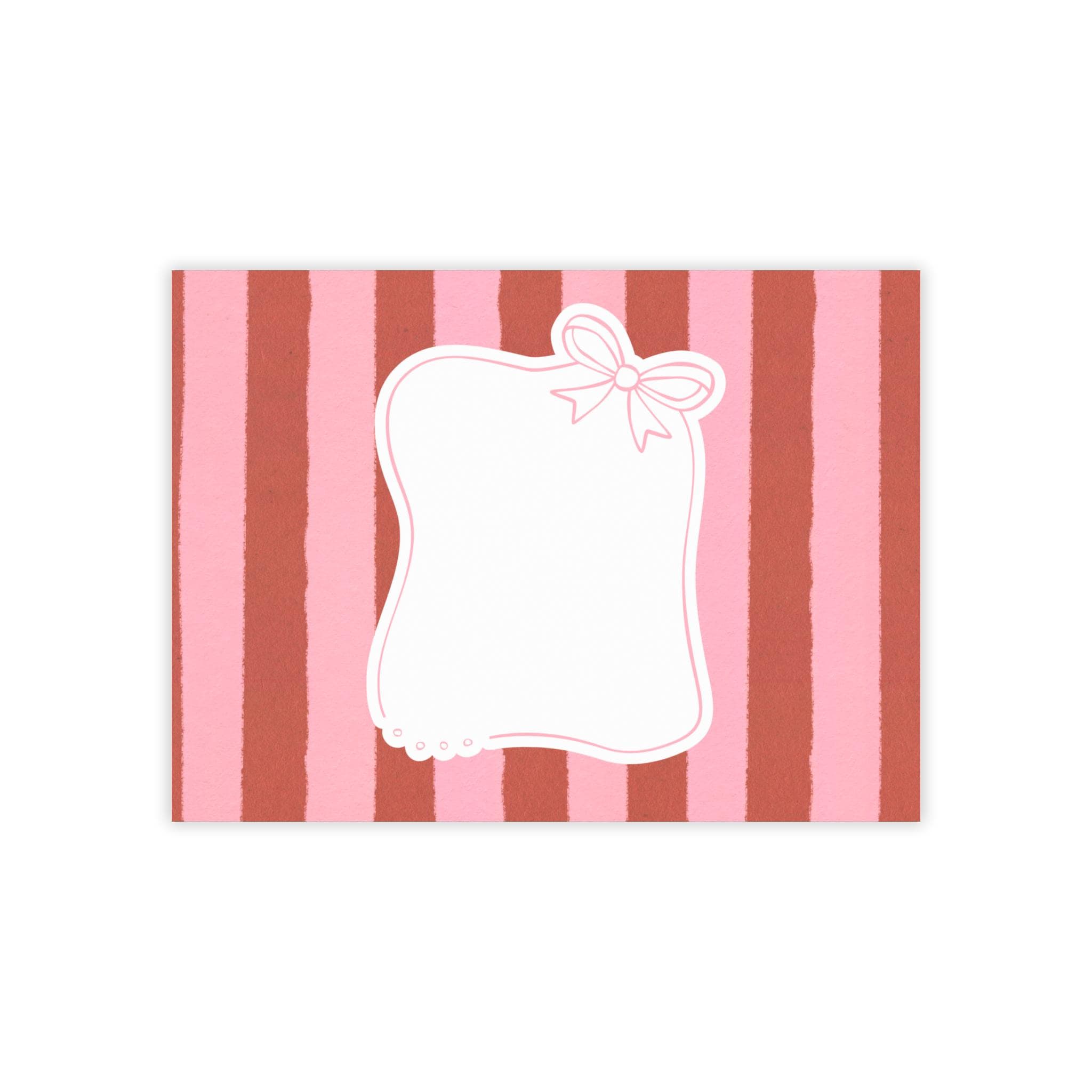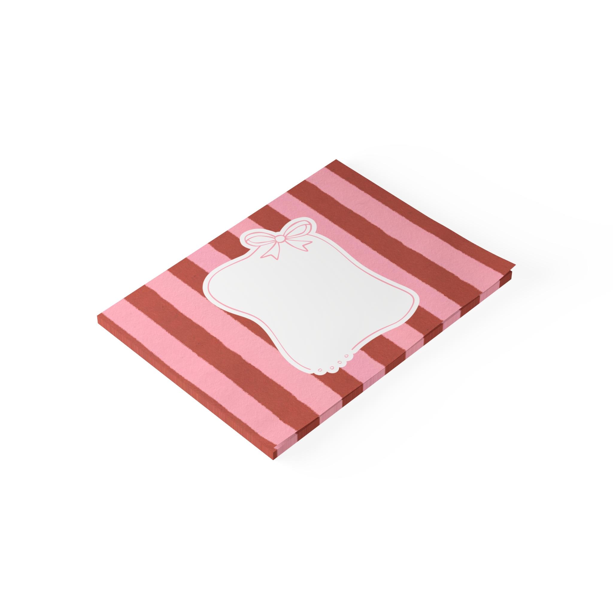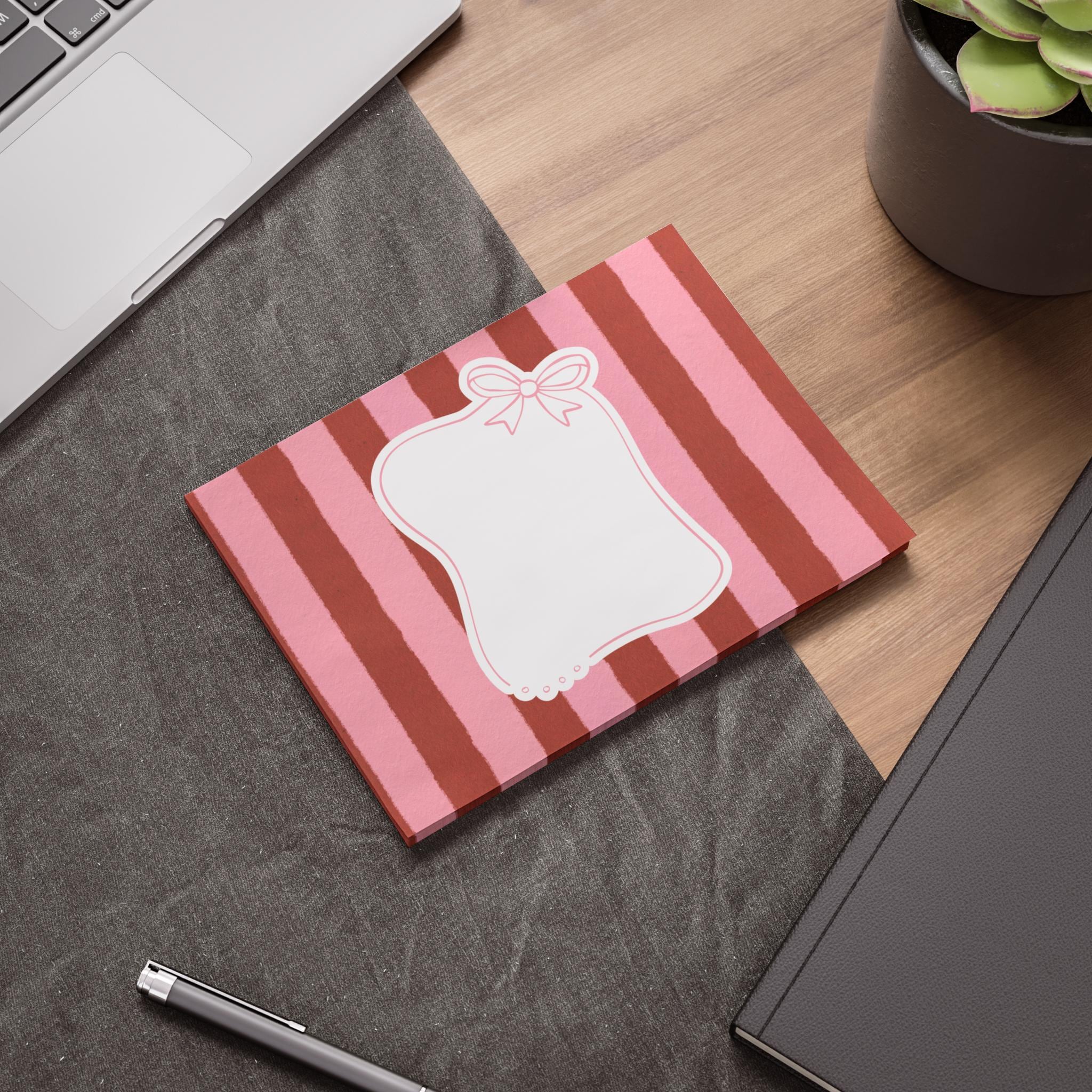 Bright, striped Post-it note pads designed to add a playful, handwritten touch to desks, planners, and gift-wrapping. Each pad features warm pink and rose-red vertical stripes framing a scalloped white writing area topped with a tiny bow motif — a sweet spot for quick reminders, little love notes, or decorative labels. The paper has a soft, slightly textured feel that takes pen and pencil cleanly, while the trusted 3M adhesive keeps notes in place without residue. Compact and cheerful, these pads tuck into tote pockets, sit beside a laptop, or stack on a nightstand for quick thoughts and small moments of delight.