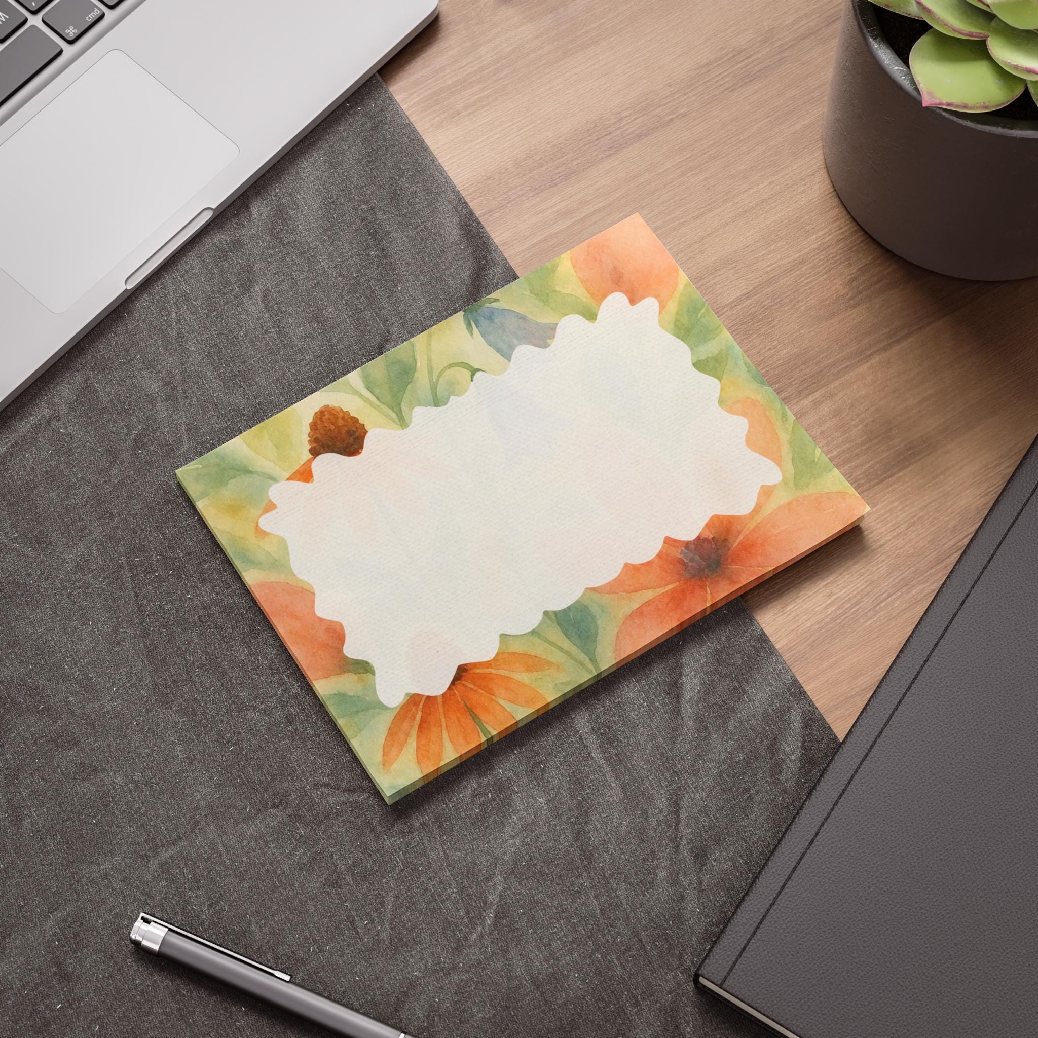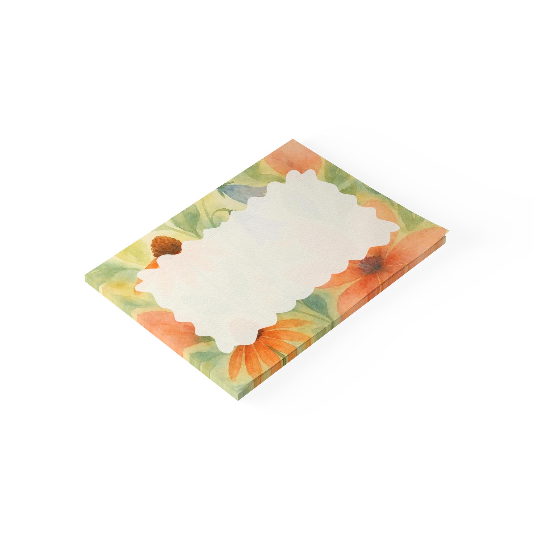 Sunlit floral Post-it® pads that bring warm, watercolor blooms to everyday notes. Each sheet frames your message with a scalloped white writing area surrounded by soft orange coneflowers and leafy greens, creating a calm, garden-like pause on your desk. The gentle palette and hand-painted feel make quick reminders, gratitude notes, and little to-do lists feel thoughtful and personal. These pads slip easily into planners, backpacks, or stationeries and add an uplifting, handcrafted touch to routine moments like morning planning, garden journaling, or sending a handwritten note.