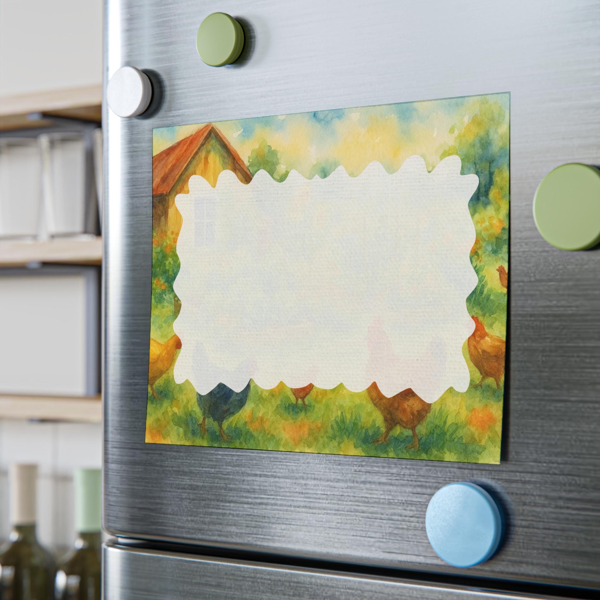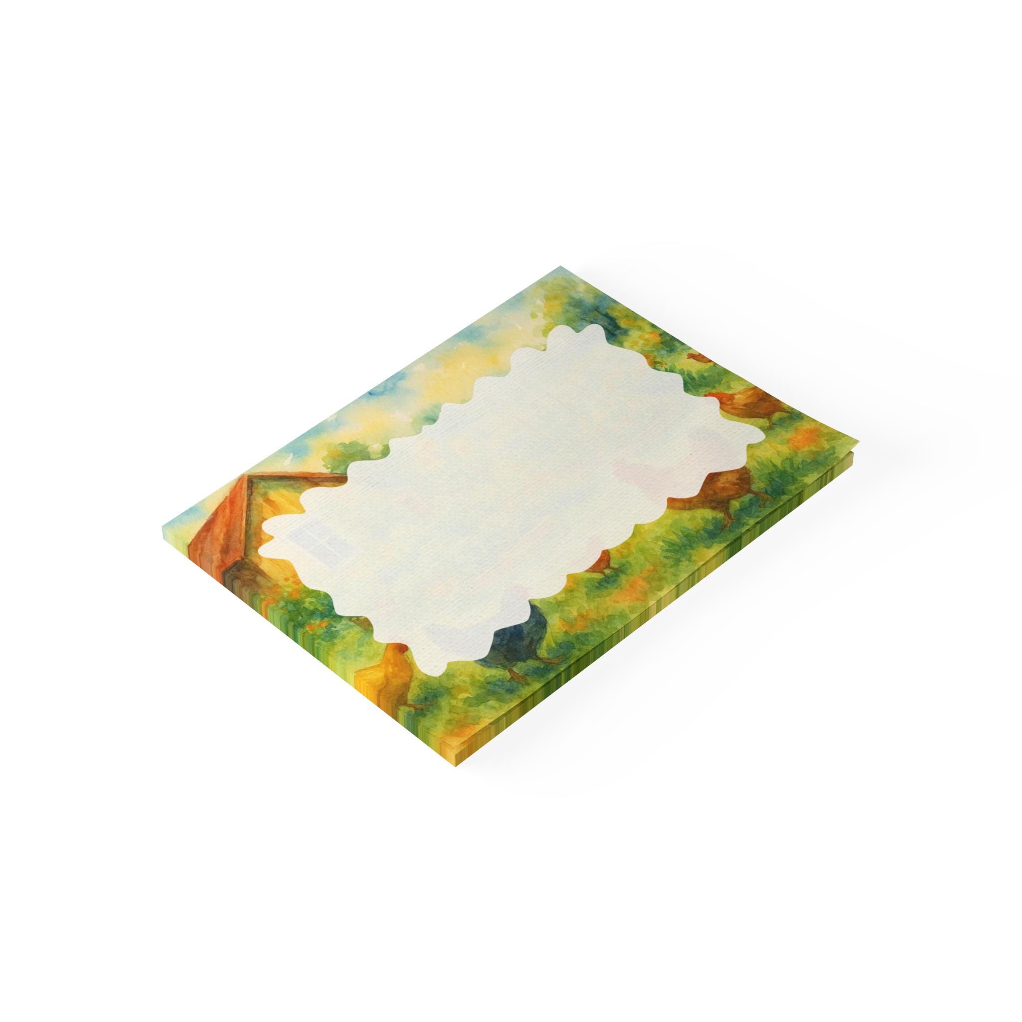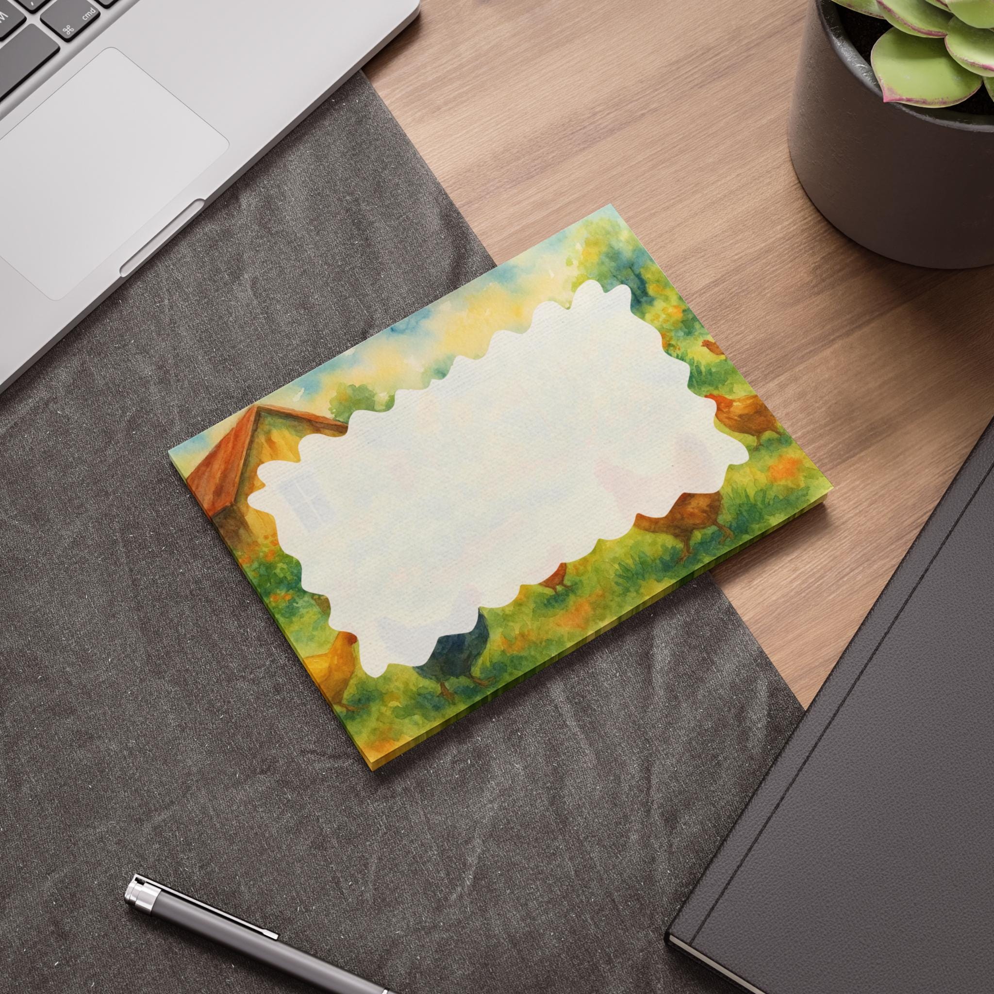 A cheerful farm-themed notepad that brings a warm, rustic touch to everyday notes. Soft watercolor greens and sunlit yellows frame a scalloped white writing area, while playful hens and a cosy barn peek from the corners. Lightweight and portable, these pads sit neatly on a kitchen counter, atop a desk, or tucked into a tote — perfect for quick lists, recipe notes, or little reminders that brighten the day. The adhesive backing keeps sheets handy on fridges or planners, and the branded Post-it® base ensures clean, sturdy use.